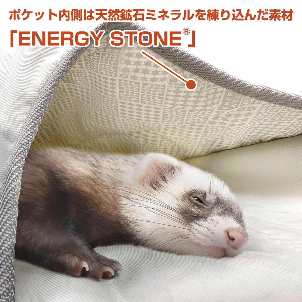 身体から自然に放出される遠赤外線エネルギーを効率よく吸収し、輻射することで、フェレットをじんわりとしたやさしいぬくもりで包み込みます。